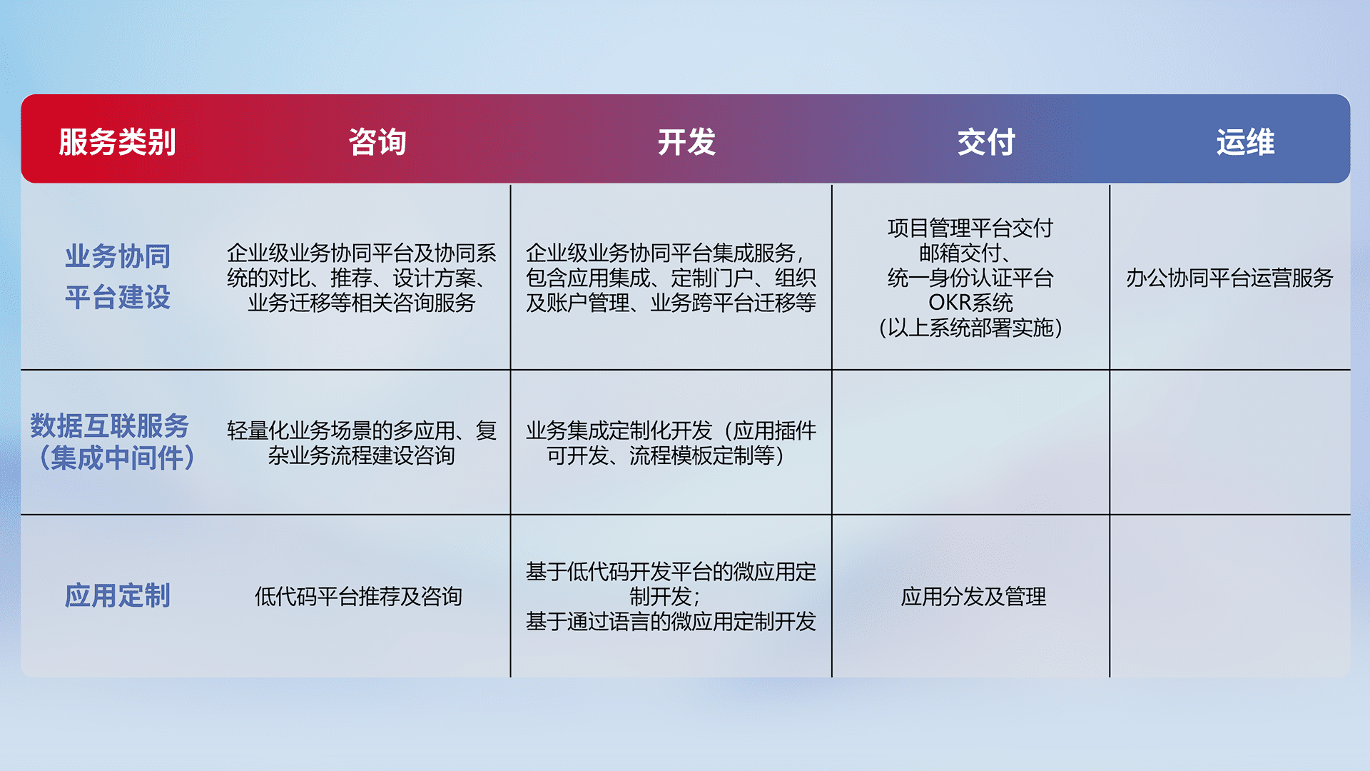 针对钉钉、、、企微、、、IDaas等平台级产品提供产品的规划、、、、方案、、交付、、、、定制化开发等服务,,,,实现如统一协同办公、、、智能客户服务、、、混合会议管理、、智能数据查询、、、等业务场景,,实现数字化转型。。