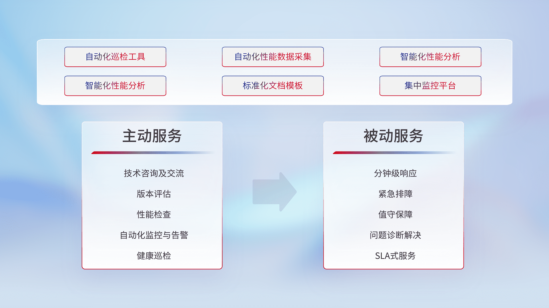 智能化工具和标准化文档,,,保障服务质量,,,,提供主动服务(包含技术咨询、、版本评估、、性能检查、、、、自动化监控与告警、、健康巡检)和被动服务包含(分钟级响应、、、紧急排障、、、值守保障、、、、问题诊断解决、、SLA服务)。。。